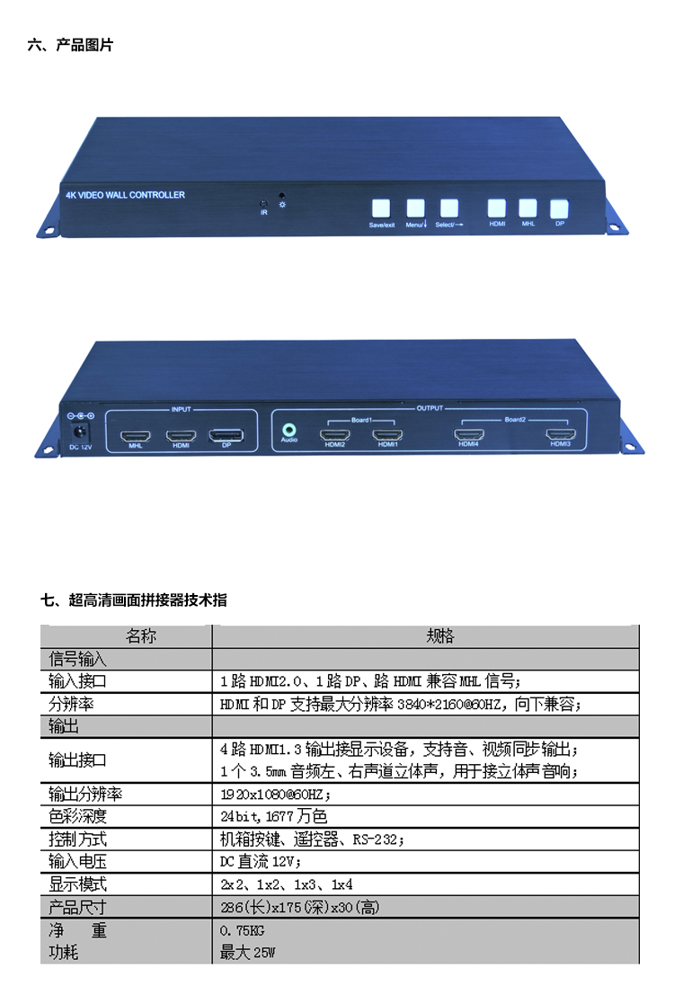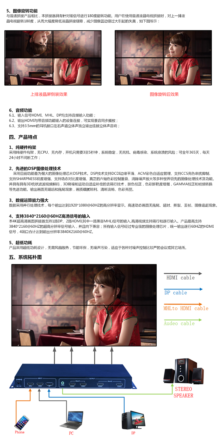 本產(chǎn)品是定制化的4K畫面拼接器,其主要功能是在M x N的拼接顯示單元上顯示一幅3840x2160@60HZ的超高清4K圖像。產(chǎn)品采用先進的圖像處理技術(shù),輸入信號最大可以支持HDMI2.0,即3840x2160@60HZ,即使在播放快速動畫的時候也不會出現(xiàn)延時、丟幀現(xiàn)像。